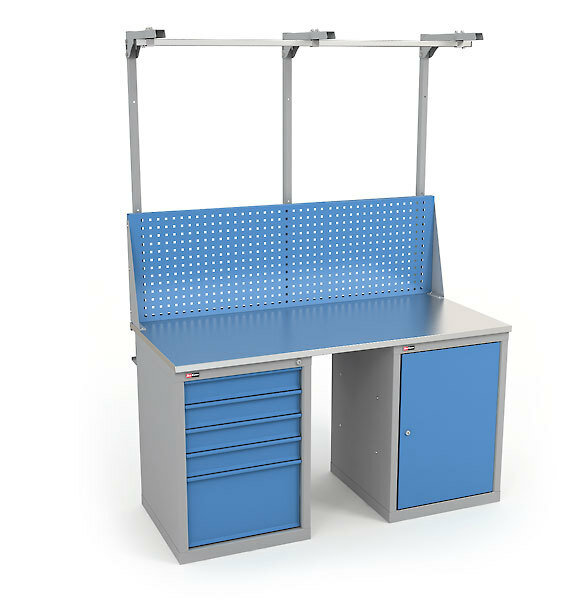 Слесарный верстак ВЛ-150-07-Э2 предназначен для слесарных и сборочных работ в мастерских, гаражах, в учебных заведениях и на производствах. Представляет собой сборно-разборную модульную конструкцию состоящую из одной тумбы ВЛ-015 с пятью выдвижными ящиками, одной тумбы ВЛ-010 с распашной дверцей и двумя полками, столешницы ЦФ из фанеры толщиной 24 мм, покрытой оцинкованным листовым металлом толщиной 0,8 мм и перефорированного экрана с квадратной перфорацией 10х10 мм. Шаг перфорации экрана 35 мм. Тумбы верстака закрываются центральными ключевыми замками Euro Lock (Германия, 10000 открываний). Дополнительно на верстак можно установить: полку нижнюю из фанеры толщиной 24 мм, дополнительный перфорированный экран, светодиодный светильник, бегунок, тиски слесарные, сетевой фильтр на шесть розеток, аксессуары на экран. Возможно заменить столешницу (ЦФ) на столешницу (Ф) без оцинкованного листа металла или установить столешницу (МФ) с окрашенным металлическим листом толщиной 3 мм, также можно заменить инструментальную тумбу с выдвижными ящиками ВЛ-015 на тумбу с распашными дверцами ВЛ-010. Под столешницу можно подвесить тумбу на 3 ящика ВЛ-003. Цвет: верстака серый Ral 7038, двери синий Ral 5012. Тип покрытия: порошковое. Поставляется в разобранном виде