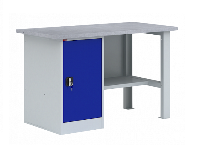 Металлические слесарный верстак ВП представляет собой рабочий стол для ручной обработки металлических, деревянных изделий, а также предметов, выполненных из других материалов. Металлический верстак используется в мастерских, гаражах, автосервисах и в других рабочих зонах. Он являются основой, как небольшого промышленного производства, так и крупного предприятия. Допустимая равномерно распределенная нагрузка на верстак - 1000 кг, на полку верстачную - 40 кг, на полку тумбы- 30 кг. В комплект верстака ВП-2 входит: столешница СТ-2 из МДФ, покрытая оцинкованным листовым металлом, стенка задняя металлическая, металлическая верстачная опора, тумба Т-1 с двумя съемными полками. Дверь тумбы закрывается ключевым замком. Тумбу можно установить как с левой, так и правой стороны верстака. Дополнительно на верстак можно установить перфорированный экран соответствующего размера, аксессуары на экран. Цвет: верстак - серый Ral 7035, дверь тумбы - синий Ral 5002
