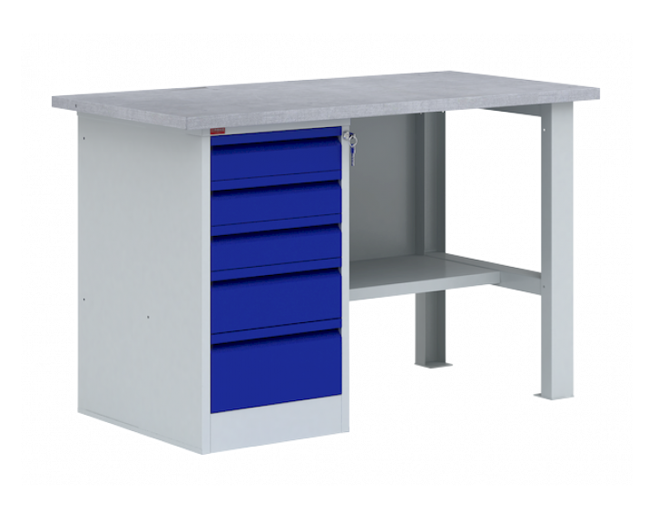 Металлические слесарный верстак ВП-3Т представляет собой рабочий стол для ручной обработки металлических, деревянных изделий, а также предметов, выполненных из других материалов. Металлический верстак используется в мастерских, гаражах, автосервисах и в других рабочих зонах. Он являются основой, как небольшого промышленного производства, так и крупного предприятия. Допустимая равномерно распределенная нагрузка на верстак - 1000 кг, на полку верстачную - 40 кг, на выдвижной ящик - 30 кг. В комплект верстака ВП-3Т входит: столешница СТ-2 из МДФ, покрытая оцинкованным листовым металлом, стенка задняя металлическая, металлическая верстачная опора, тумба Т-2Т с пятью выдвижными ящиками на телескопических направляющих. Тумба закрывается центральным ключевым замком. Тумбу можно установить как с левой, так и правой стороны верстака. Дополнительно на верстак можно установить перфорированный экран соответствующего размера, аксессуары на экран. Цвет: верстак - серый Ral 7035, дверь тумбы - синий Ral 5002